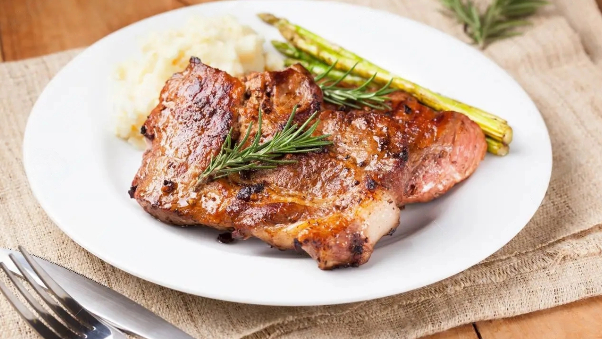 Costillas de cerdo con puré de papas y espárragos