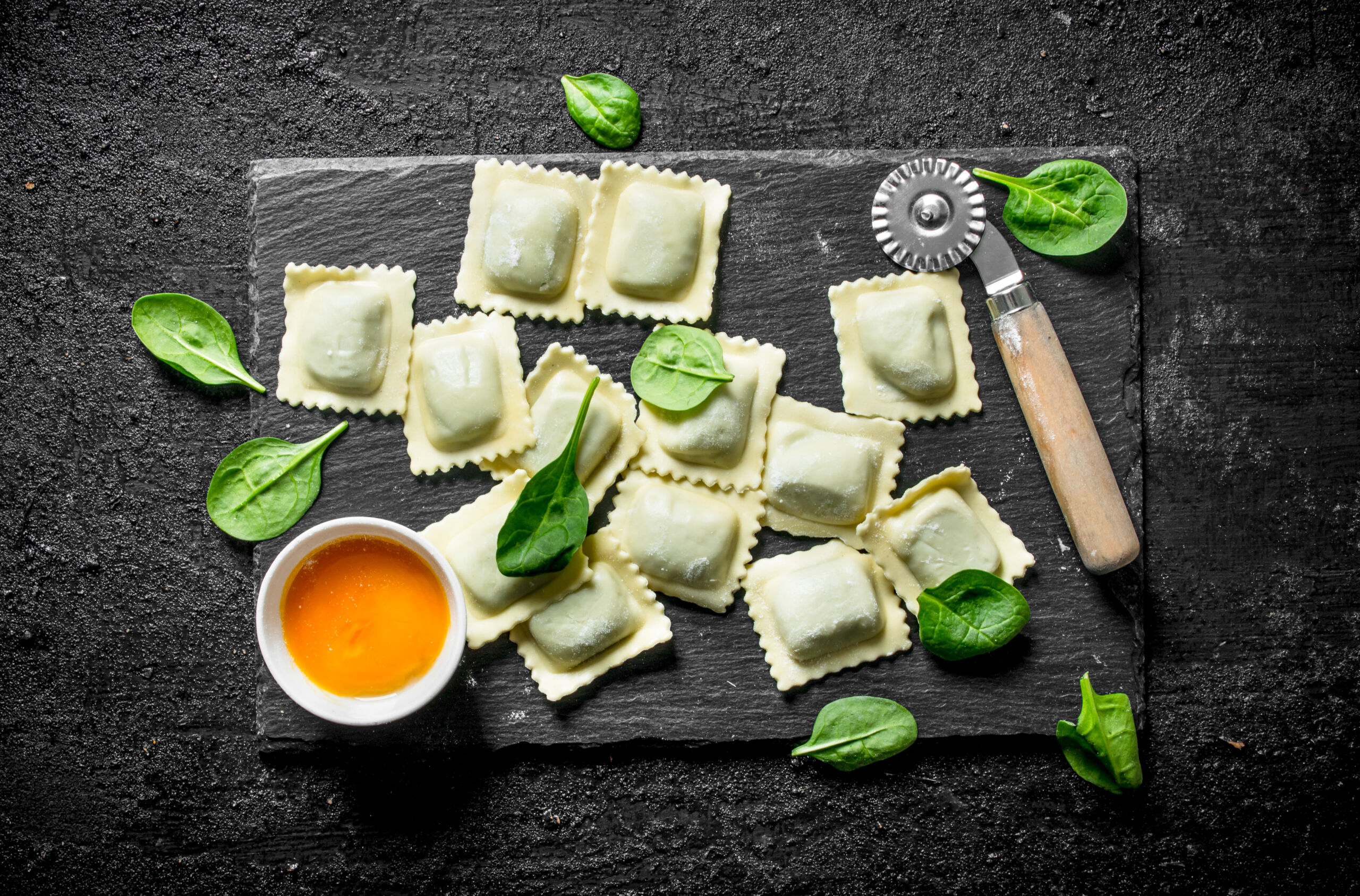 2. Rellenar la pasta: Extender la masa de pasta sobre una superficie ligeramente enharinada hasta que esté delgada. Colocá pequeñas porciones de relleno sobre una lámina de pasta, dejando espacio entre ellas. Cubrí con otra lámina de pasta y sellá los bordes alrededor del relleno. Cortá los ravioles con un cortapastas o un cuchillo.